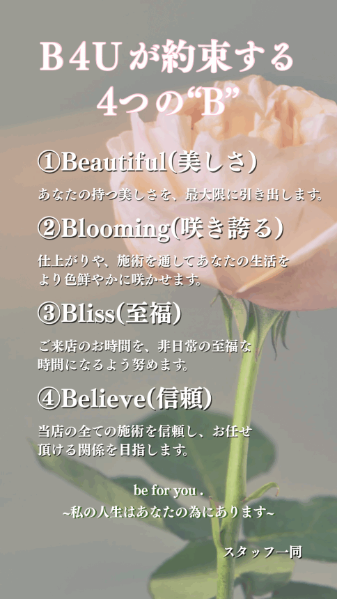 Hair Salon B4U ではこのポリシーを常に心掛けながら、お客様との大切なお時間を過ごしていきます。